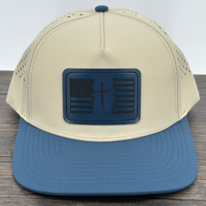 Premium Christian patriotic hat featuring laser-engraved 3 nail cross and American flag on leatherette patch. Sweat-proof, water-resistant mesh back cap. The hat has a snap closure for adjustable fit. Perfect faith-based gift for patriots. It is ideal for the person who wants to show their love of God and their country.