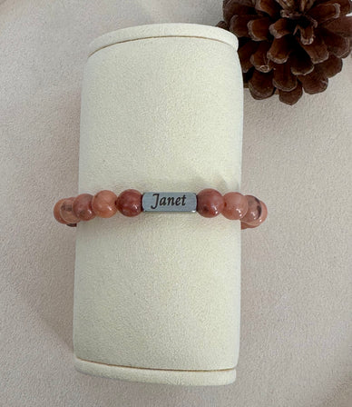 Custom Engraved Pink Aventurine Beaded Bracelet with Stainless Steel Bar that can be engraved with a name.