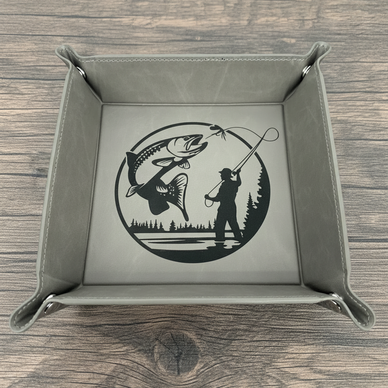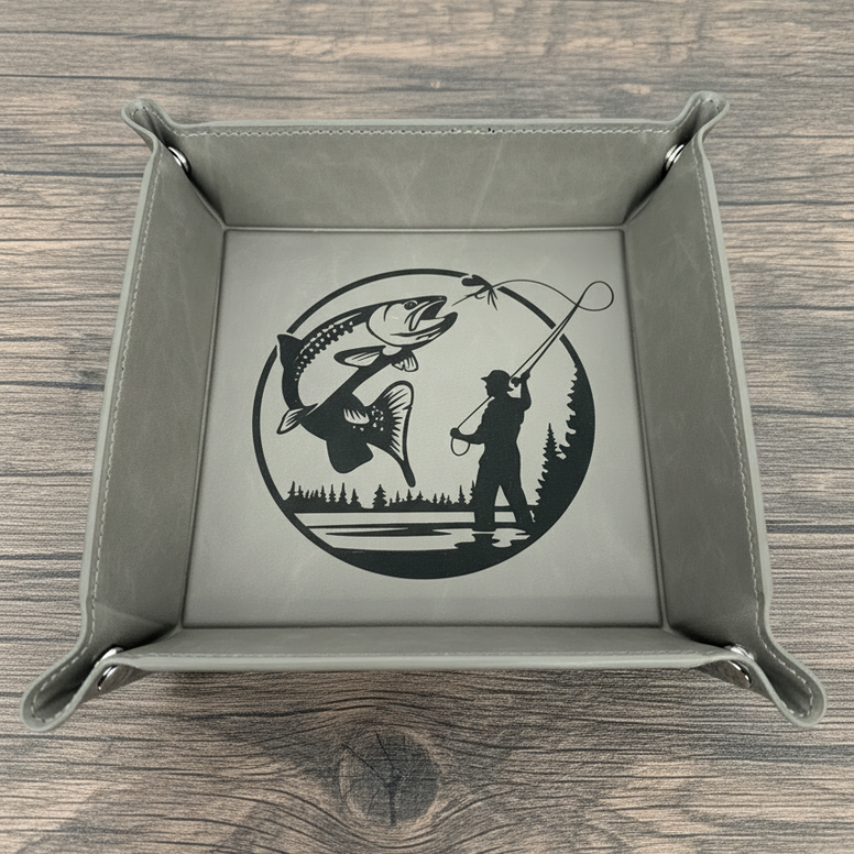 Stay organized with our beautifully crafted fly fishing valet tray. This premium leatherette organizer features a detailed laser-engraved fly fishing scene—perfect for keeping your keys, wallet, watch, and everyday essentials in one handsome place. Ideal for your dresser, nightstand, or entryway table.