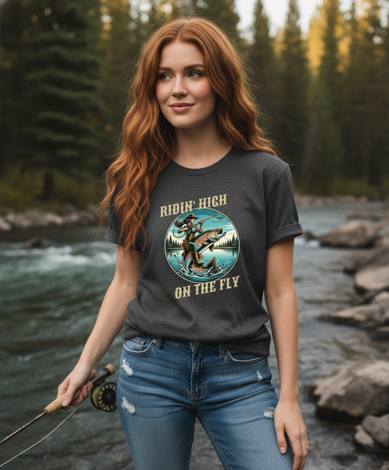 Celebrate your passion for fly fishing with this comfortable women's t-shirt featuring the playful 'Ridin' High On The Fly' design. Perfect for anglers who love spending time on the water, this tee combines style with your love of the sport. Whether you're casting a line or relaxing riverside, this shirt is a great way to show your fly fishing pride.